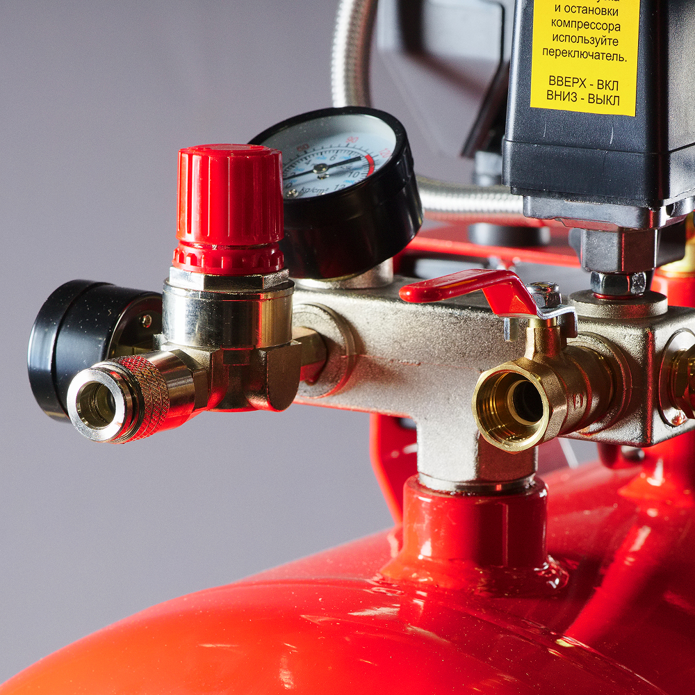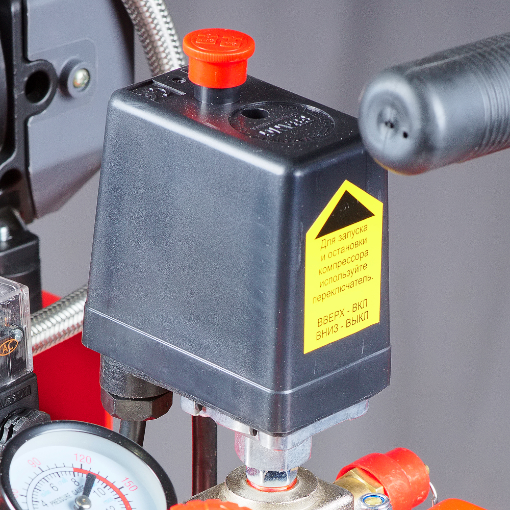 - Прессостат для поддержания заданного давления в ресивере и обеспечения повторного запуска.