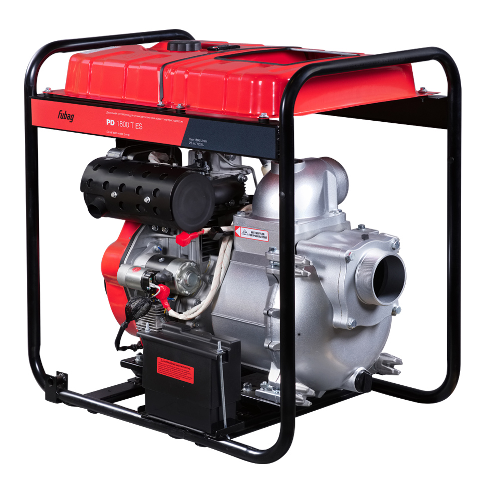 Дизельная мотопомпа FUBAG для сильнозагрязненной воды - автономно работающее устройство производительностью 1800 л/мин, перекачивающее грязную воду с абразивными включениями диаметром до 27 мм.Помпа PD 1800 T ES подходит для откачивания воды с песком и мелкими камнями. Оснащена дизельным двигателем с воздушным охлаждением мощностью 9,4 кВт, предназначенным для тяжелых условий эксплуатации. Графитовые сальники и специальная усиленная конструкция улиты насоса, изготовленной из термически обработанного чугуна, гарантируют повышенный ресурс работы. Дизельные помпы FUBAG оптимальны для работ в сельском хозяйстве, на строительных площадках, промышленных предприятиях, в коммунальном хозяйстве, при разработке карьеров, шахт, очистки загрязненных водоемов, откачки котлованов, в условиях паводка. Дизельный двигатель легко запускается с помощью электростартера.